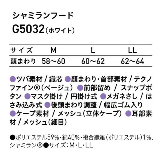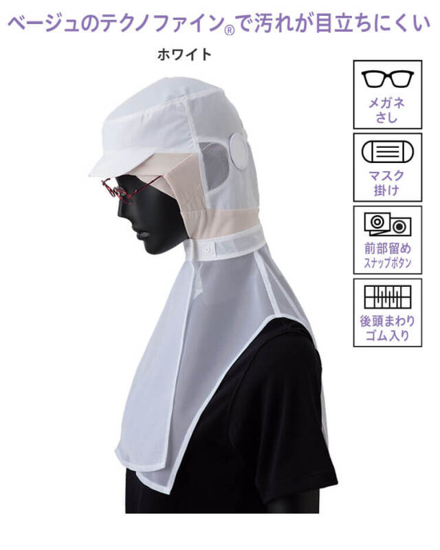 SERVOサーヴォの衛生白衣帽子です。異物混入対策が必要な食品工場全般に最適なフードタイプです。異物混入対策に特化した、食品工場全般に適したタイプです。首から胸にかけてケープが付いているので、体毛落下防止をより強化した形状が特長です。シャミラン素材は、ムレない、ベトつかない、麻のような肌触りが特長です。体からの熱や不快な湿気を効率的に放出する通気性と速乾性を備え、麻のようなシャリ感のある肌触りが快適さを向上。着用時の暑さを和らげます。メガネのフレームをはさみ込むため、スリット式よりも隙間がなく、毛髪落下をより防げます。ベージュのテクノファインで汚れが目立ちにくいです。
