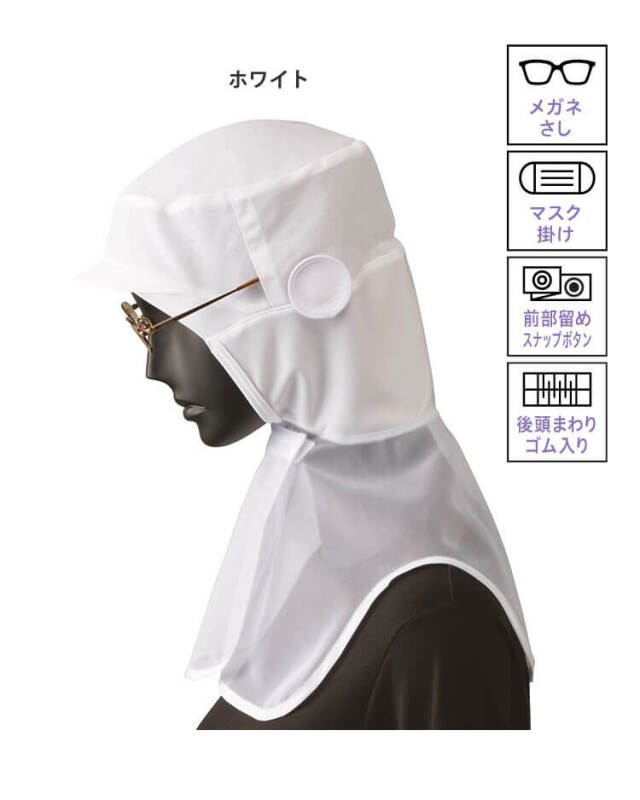 SERVOサーヴォの衛生白衣帽子です。異物混入対策が必要な食品工場全般に最適なフードタイプです。異物混入対策に特化した、食品工場全般に適したタイプです。首から胸にかけてケープが付いているので、体毛落下防止をより強化した形状が特長です。シャミラン素材は、ムレない、ベトつかない、麻のような肌触りが特長です。体からの熱や不快な湿気を効率的に放出する通気性と速乾性を備え、麻のようなシャリ感のある肌触りが快適さを向上。着用時の暑さを和らげます。メガネさしは、スリットにツルを差し込むだけなので、着脱が容易に行えます。カラー展開も豊富な人気商品です。