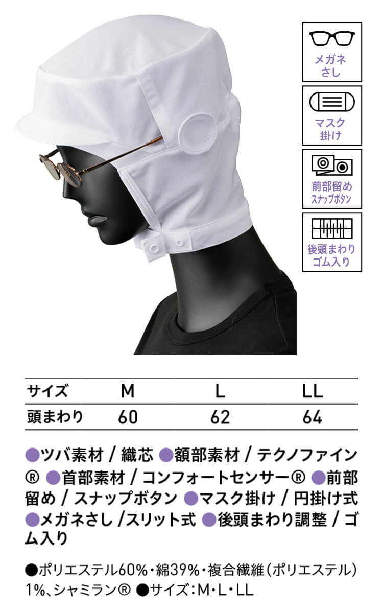 SERVOサーヴォの衛生白衣帽子です。ケープなしのショートフードタイプです。異物混入対策を意識したフードタイプ同等のディテールを備えつつ、コストをやや抑えられます。給食サービスや軽作業中心の工場に適しています。シャミラン素材は、ムレない、ベトつかない、麻のような肌触りが特長です。体からの熱や不快な湿気を効率的に放出する通気性と速乾性を備え、麻のようなシャリ感のある肌触りが快適さを向上。着用時の暑さを和らげます。メガネさしは、スリットにツルを差し込むだけなので、着脱が容易に行えます。