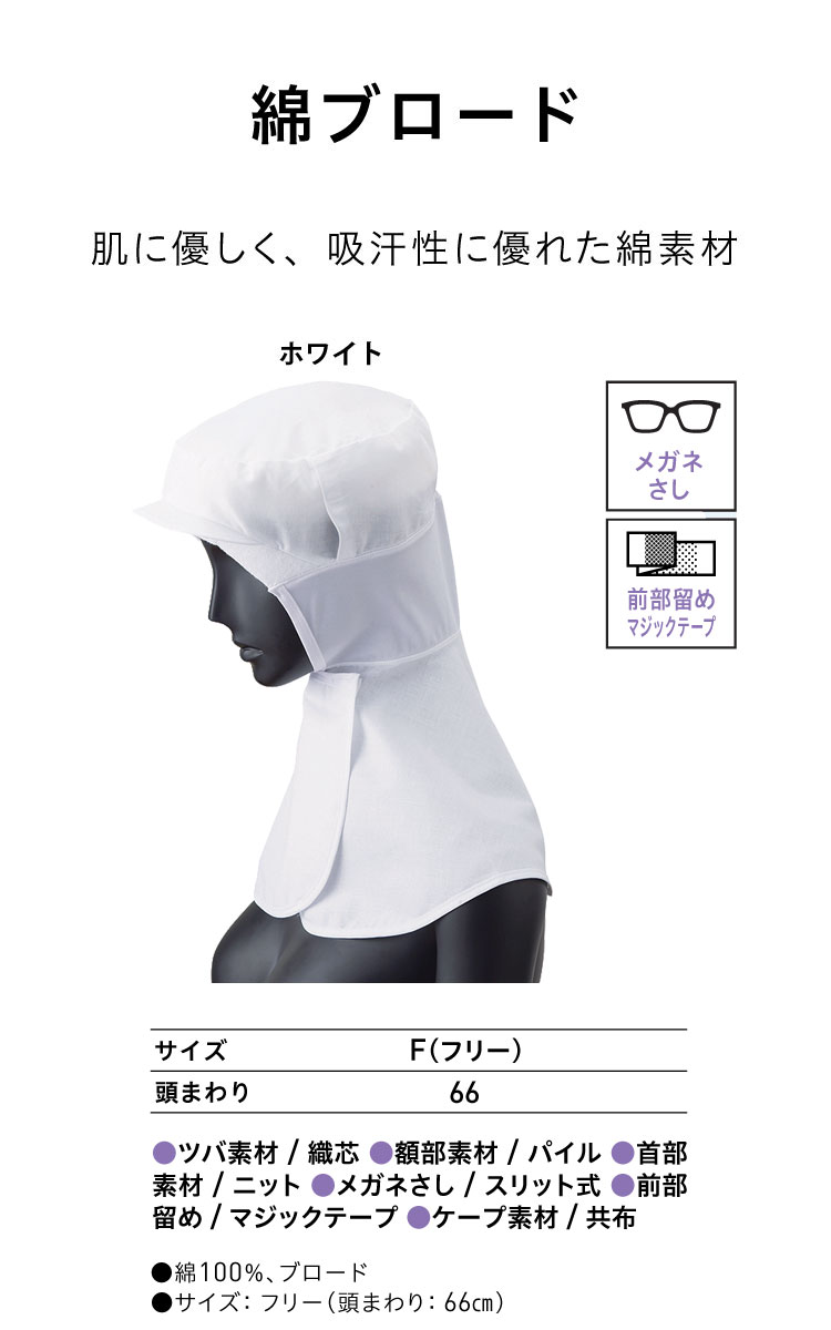 SERVOサーヴォの衛生白衣帽子です。異物混入対策が必要な食品工場全般に最適なフードタイプです。異物混入対策に特化した、食品工場全般に適したタイプです。首から胸にかけてケープが付いているので、体毛落下防止をより強化した形状が特長です。綿ブロード素材は、肌に優しく、吸汗性に優れた素材です。メガネさしは、スリットにツルを差し込むだけなので、着脱が容易に行えます。