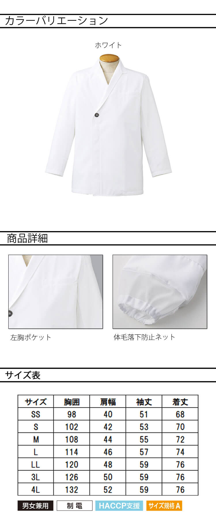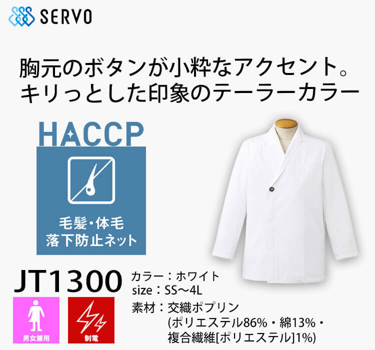 サーヴォのHACCP支援のテーラーカラーショップコートです。体毛落下防止ネットを袖の裏地に採用し、食への安全に配慮しています。左胸にはポケットが付いています。胸元のボタンが小粋なアクセントになっています。制電機能が備わっています。男女兼用で着用者を問いません。