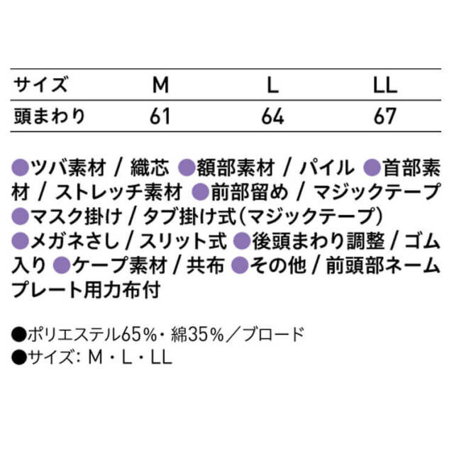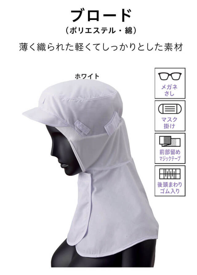 SERVOサーヴォの衛生白衣帽子です。異物混入対策が必要な食品工場全般に最適なフードタイプです。異物混入対策に特化した、食品工場全般に適したタイプです。首から胸にかけてケープが付いているので、体毛落下防止をより強化した形状が特長です。ブロード素材は、薄く織られた軽くてしっかりとした素材です。メガネさしは、スリットにツルを差し込むだけなので、着脱が容易に行えます。