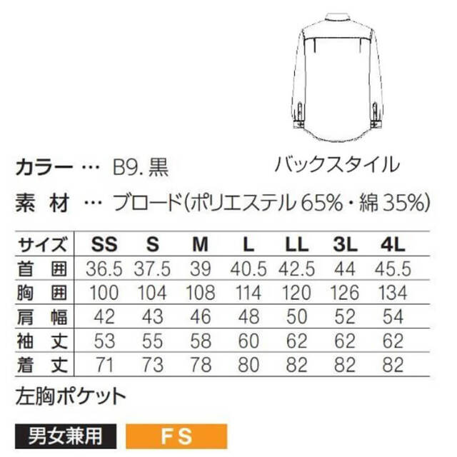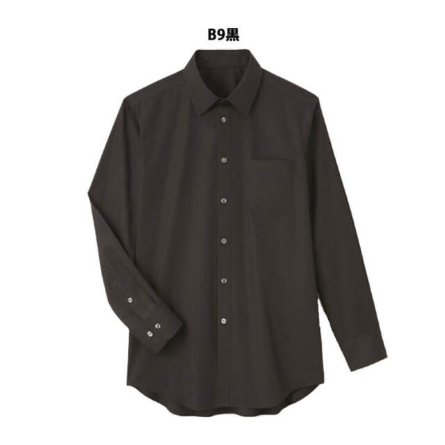 汎用性の高い定番の長袖シャツ。黒、台衿付きシャツカラー、後ヨーク切替にタックが入っています。左胸にパッチポケット、袖口カフスにはサイズ調節できるように2つボタンが付いています。前立て下部には替えボタン付き。