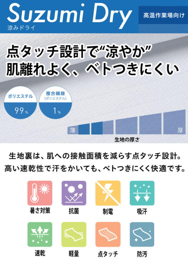 【暑さ対策】【抗菌】【制電】【吸汗】【速乾】【点タッチ】【軽量】【防汚】