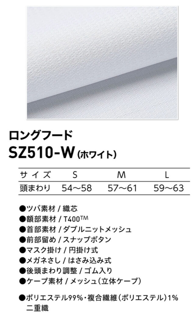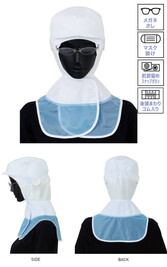 SERVOサーヴォの衛生白衣帽子です。異物混入対策が必要な食品工場全般に最適なフードタイプです。異物混入対策に特化した、食品工場全般に適したタイプです。首から胸にかけてケープが付いているので、体毛落下防止をより強化した形状が特長です。涼みドライ(Suzumi Dry)は、生地の裏は、肌への接触面積を減らす点タッチ設計だから、汗をかいてもベトつきにくく、快適です。メガネのフレームをはさみ込むため、スリット式よりも隙間がなく、毛髪落下をより防げます。インナーは、はみ出していれば周りの人にも一目でわかる色付き仕様です。