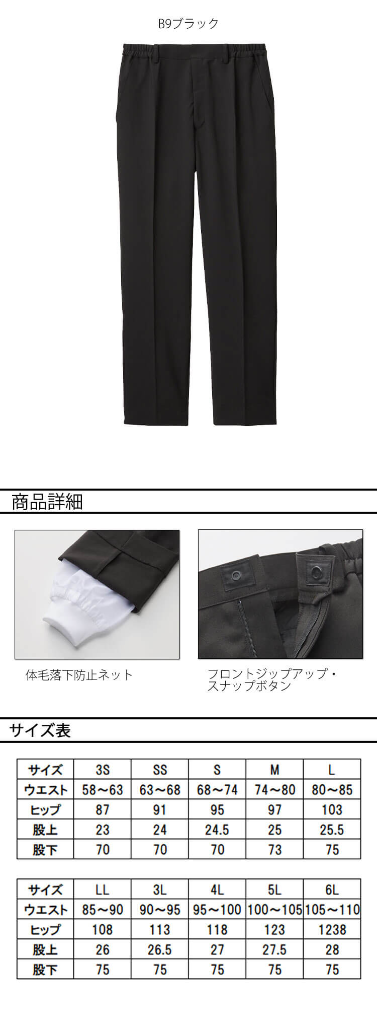 サーヴォのいいとこどりパンツの体毛落下防止ネット付きです。異物・体毛の落下をインナーのニットとネットが裾口でガードします。男女兼用で、シーンや着用者を問わずおすすめです。かがんでも背中が出にくく作業がしやすいです。長く愛用して欲しいから、洗濯耐久性に優れた素材を採用しました。ストレッチ性に優れたパンツで、後ろ脇ゴム仕様でお腹周りもゆったりと着用でき、動きやすいです。