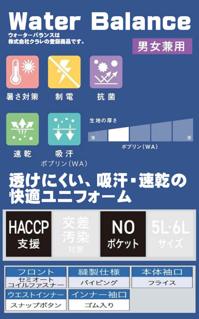 SERVOサーヴォの衛生白衣の長袖ジャンパーです。高温作業場向けのユニフォームです。ウォーターバランス素材は、繊維組織の隙間による吸汗性、防透性を実現した素材です。シャミラン素材は、ムレない、ベトつかない、麻のような肌触りが特長です。体からの熱や不快な湿気を効率的に放出する通気性と速乾性を備え、麻のようなシャリ感のある肌触りが快適さを向上。着用時の暑さを和らげます。