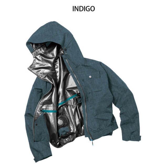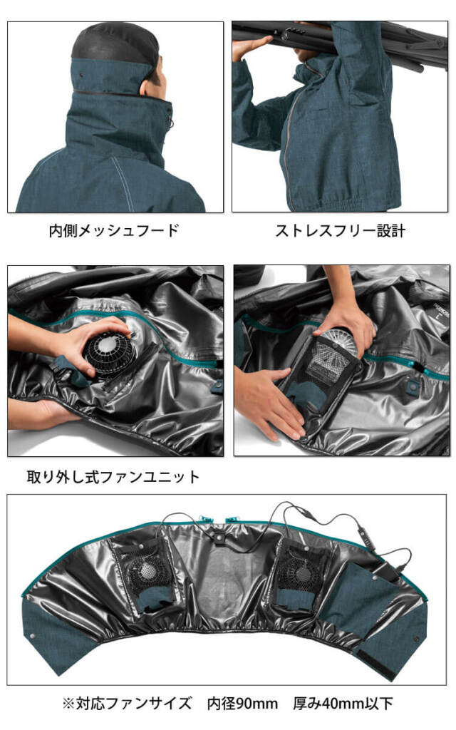 ファンを取り付けられるプロ向けレインブルゾン。腰道具とあわせて使えるショート丈。