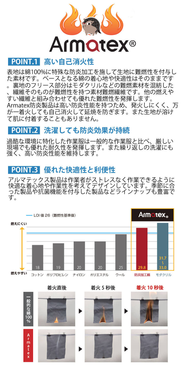 ・厳しい作業環境でも優れた耐久性を発揮し、繰り返しの洗濯後も高い防炎効果を維持