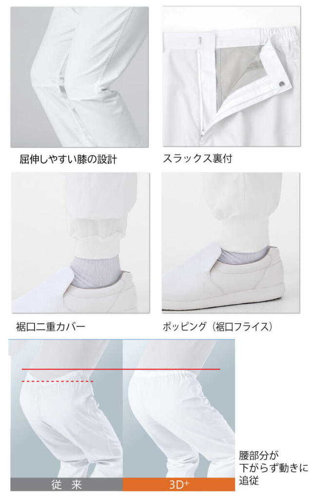 KAZENカゼン食品衛生白衣のスラックスです。暑熱環境向けのユニフォームです。製造現場で働く方の腕や肩、膝の動きなどを徹底的に研究し、圧迫感や窮屈さなどの動きにくさを軽減する3D+特殊パターン設計を採用しています。軽量で通気性に優れた涼感素材で生地の表側はフラットで滑らかに仕上げ、肌に接する裏側は凹凸を出すことで肌離れを良くしています。
