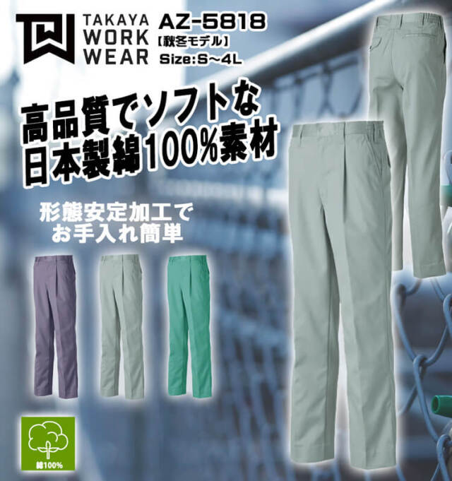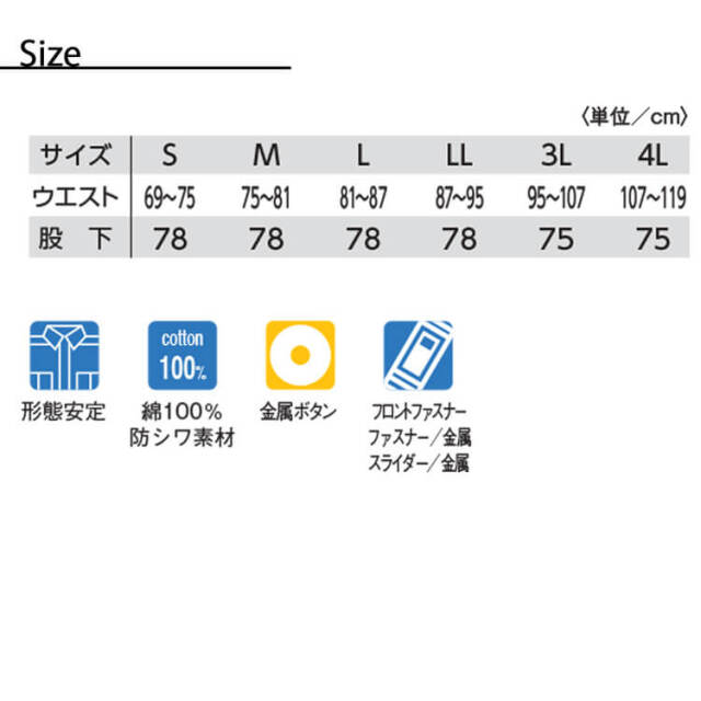 防縮・防シワ加工を施した扱いやすくソフトな綿100%作業服。パンツは脇ゴム(シャーリング)仕様で動きやすく、履きやすい。高品質の日本製素材を使用しています。