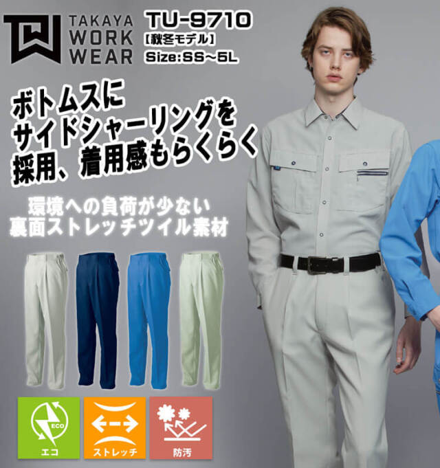 汚れに強く、幅広いワークシーンで活躍するエコ裏綿ストレッチ。ケミカルリサイクル繊維を使用したグリーン購入法判断基準対応アイテム。帯電防止、ストレッチ性、形態安定性にも優れた高機能パンツ。