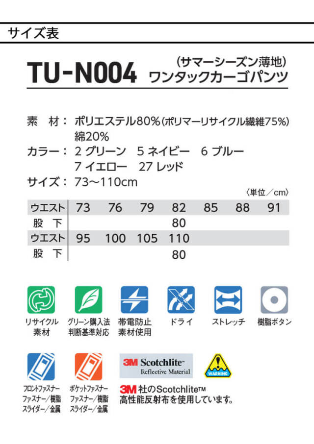 | 製品名: | タカヤ商事 タカヤワークウェア ワンタックカーゴパンツ TU-N004 春夏 長袖 製品制電 エコ 作業着 Night Knight ナイトナイト |
