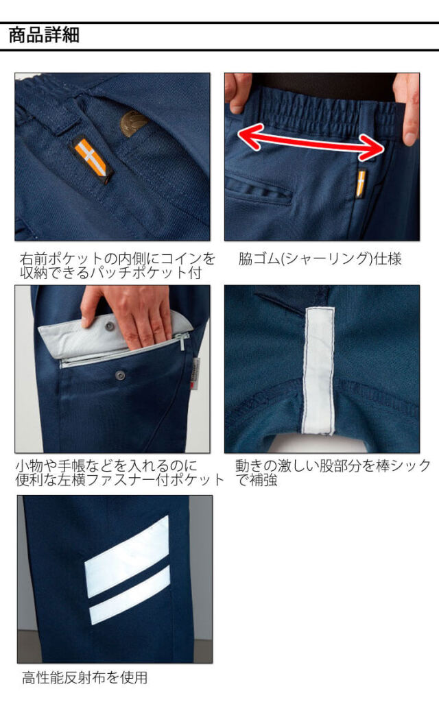タカヤ商事の帯電防止のワンタックカーゴパンツです。要所に配置した3M™Scotchlite™反射材で周囲からの視認性を確保し、夜間作業や倉庫内作業等での車両事故リスクを軽減しています。撥水加工や帯電防止素材を使用したワンタックカーゴパンツです。環境への負荷が少ないグリーン購入法判断基準対応の作業服です。