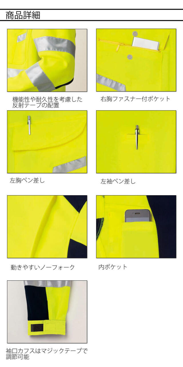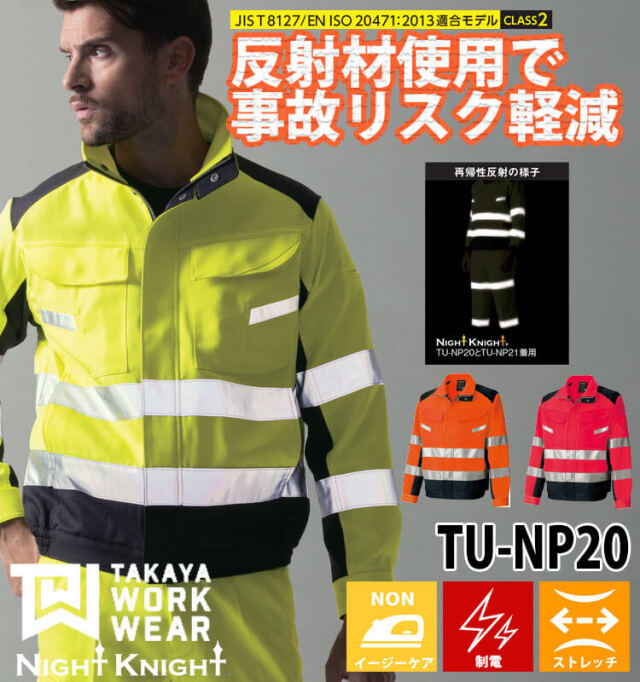 タカヤ商事の高性能高視認性安全ジャケットです。JIS T 8127高視認性安全服の規格に適合する製品を展開しているNight Knightシリーズです。反射材使用で夜間作業や倉庫内作業等での対車両事故リスクを軽減します。高視認性安全服は、明所及び暗所における車両、建機などの移動体の前照灯の下でどのような光に対しても、運転者又は機械作業者に対し着用者を目立たせることを目的とする衣服です。高い視認性という機能だけではなく耐久性、帯電防止性、軽量性、透湿性、防水性、ストレッチ性等の快適性を考慮した製品を展開しています。