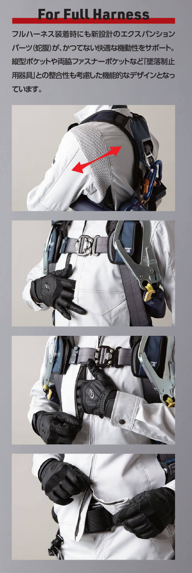 アームホールと肘に配置された蛇腹の構造+ストレッチ素材により各段にアップした動作性能で、作業者の作業効率の増とストレスの減を同時に叶えるという、これまでの作業服の概念を変えたタカヤワークウェア史上最大のパフォーマンスモデルです。 様々なツールを格納できるポケットを配置し、機動力・収納力もアップ。フルハーネスの着用時にもストレスがかからないよう、蛇腹+ストレッチでの機動力の確保、縦型・両脇のポケットの配置も計算しつくされています。カラーバリエーションは多彩なシーンに対応できる6色展開。作業者のモチベーションや企業のイメージをアップさせる個性的で知的な配色です。同シリーズのEXカーゴパンツでボトムと色替えで組み合わせるコーディネートで「ユニフォーム」でありながらもオシャレでスマートな印象を演出。配色で使われている素材を揃える事で、違う色のセットアップでもなじみます。上からも下からも開くことができる逆開ファスナー搭載。かがんだ時の腹部のふくらみを下からファスナーを開けることで解消します。「現場をスタイリッシュに。」というタカヤワークウェアならでは小さいながらも大事な配慮を機能に落とし込みました。レディース対応サイズも豊富なダイバーシティモデルです。