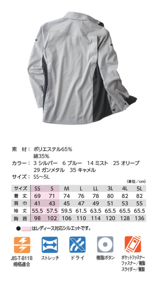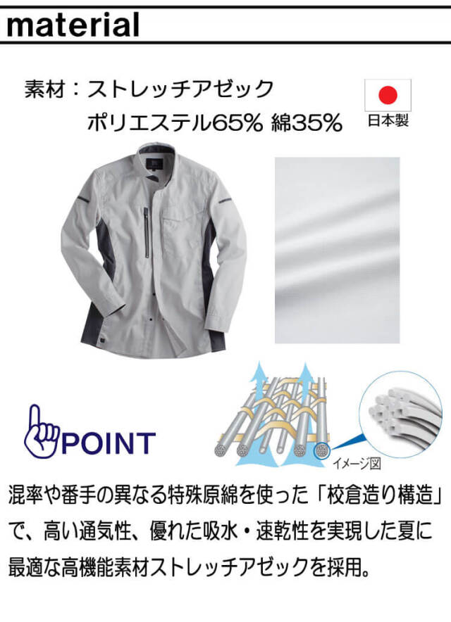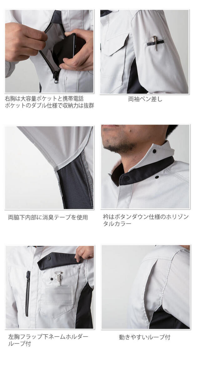 混率や番手の異なる特殊原綿を使った校倉造り構造で、高い通気性、優れた吸水・速乾性を実現した夏に最適な高機能素材ストレッチアゼックを採用しています。豊富なカラー展開で多彩なコーディネートに対応。レディースサイズも充実したダイバーシティモデルです。右胸には大容量縦ポケットと携帯電話ポケットのダブル仕様。左胸フラップ下にはネームホルダーループ付き。両袖にペン差しパーツを搭載した、抜群の収納力を持つ長袖シャツです。消臭テープやノーフォーク仕立てなど、機能も充実。2トーンカラーでシャープな印象、スタイリッシュさも兼ねそろえたスタンダードシリーズです。