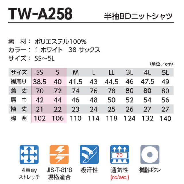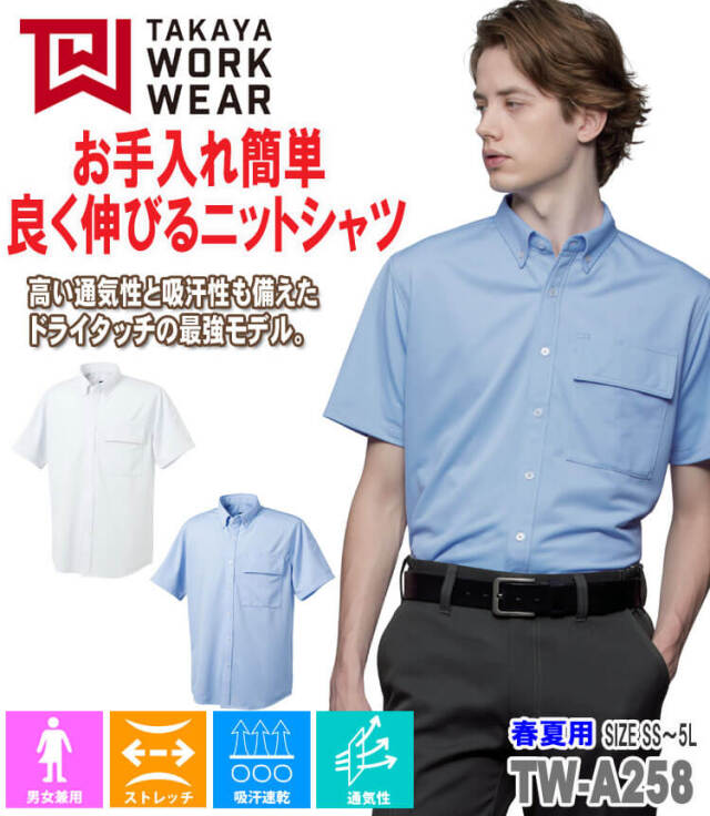| 製品名: | TAKAYA 半袖BDニットシャツ TW-A258 タカヤ商事 作業服 春夏用 男女兼用 |