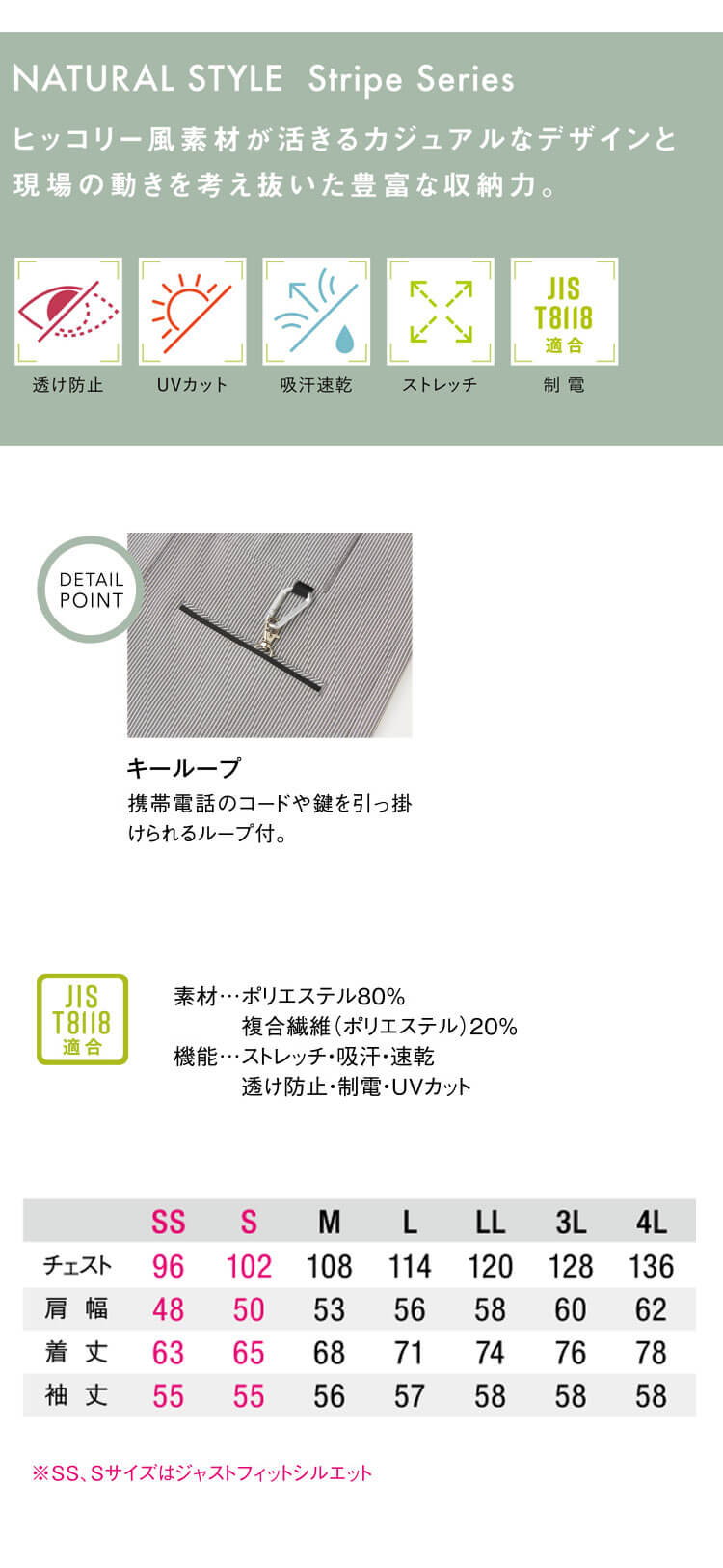 アメカジワークと今っぽさのカジュアル感がミックスされた着やすいナチュラルなアウターです。みんなに似合うヒッコリー風素材が活きるカジュアルなデザインと現場の動きを考え抜いた豊富な収納力を搭載しています。