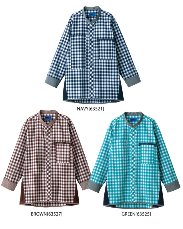 おしゃれギンガムとニットの切り替えで、デザインと機能性両立!爽やかなギンガムシャツ。なんでも入って便利なスラッシュポケット・長めの着丈で体形カバー・動きがらくらくな脇のニット切り替え・ペン差し付きポケットでしっかり収納!63521 63525 63527
