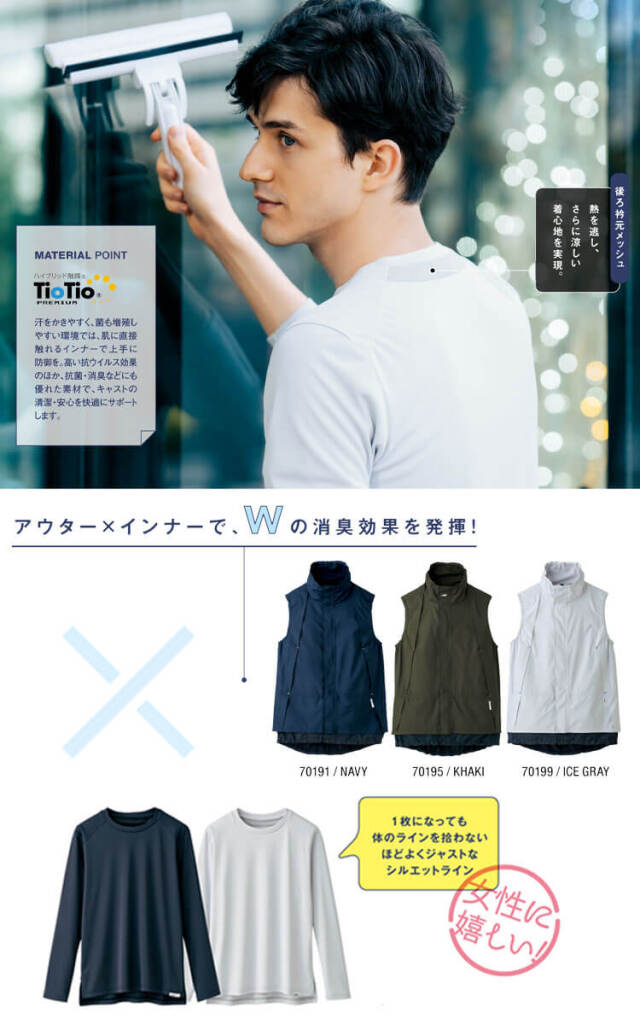 汗をかきやすく、菌も増殖しやすい環境では肌に直接触れるインナーで上手に防御できます。高い抗ウイルス効果のほか、抗菌・消臭などにも優れた素材で、キャストの清潔・安心を快適にサポートします。後ろ衿元メッシュは熱を逃がし、さらに涼しい着心地を実現します。