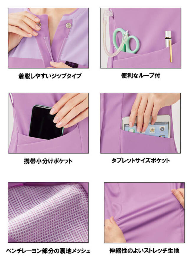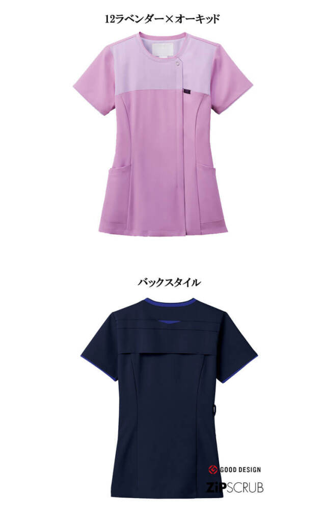 体に沿った形で、女性の曲線的な美しさを意識したメリハリのあるシルエットは、ウエスト周りをスッキリ見せてくれる、女性に嬉しいジップスクラブ。 ストレッチ性のあるソフトなリブ素材を首回りと袖口にポイントであしらうことで、肌当たりが良く快適です。 同系色で組み合わせた配色と、丸首のデザインで、柔らかく優しい印象に。幅広い職種の方に着用いただけるスクラブとなっています。 軽くて丈夫な素材のアリオンストレッチは、伸縮性のよいストレッチ生地で、動きやすさはもちろん、ポリエステル100%で、優れたイージーケア性も嬉しいポイント。 後身頃の構造を利用をして、ベンチレーション機能を追加。通気性のあるメッシュ生地を裏地に採用することで、空気が抜けるだけでなく、熱がこもらないので、空気循環を促してくれて、一日中着用していても、ストレスなく快適にお仕事していただけます。 同型のメンズジップスクラブ(7080SC)と合わせて採用することで、施設内に一体感を持たせた、コーディネートが可能。 グッドデザイン賞受賞のジップスクラブは、髪型の乱れやメイク崩れのストレスを解消した、「羽織って着られる」脱着のしやすさも高く評価されているスクラブです。
