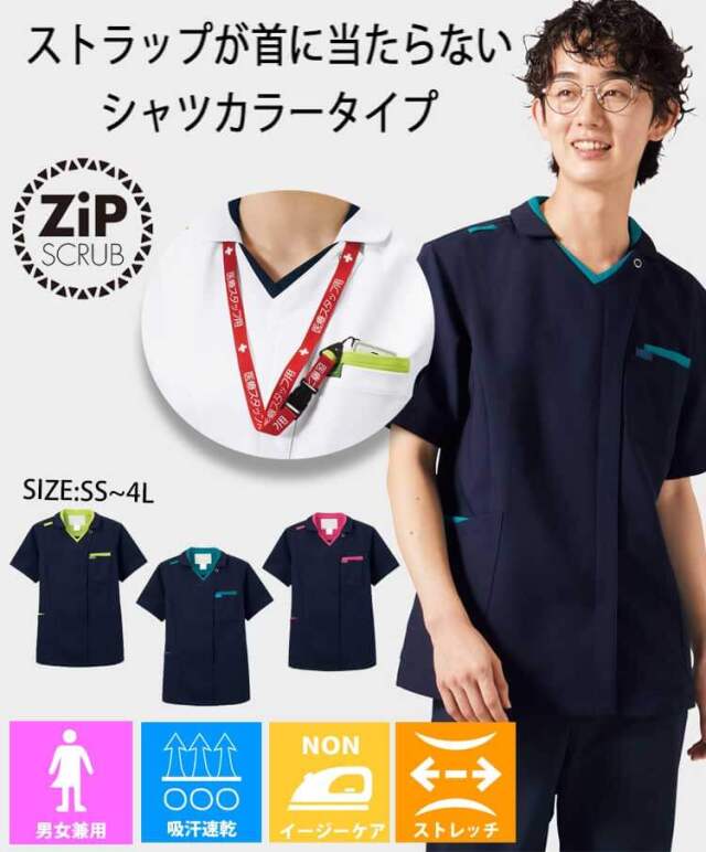 高機能素材ライトフィックスを使用した男女兼用ジップスクラブ。ライトフィックスは軽量で伸縮性があり、吸水速乾、制電機能も備えた素材です。襟付き仕様のため、首掛けストラップを使用する方にもおすすめ。また、羽織って着るジップタイプなので、着脱時に髪型が乱れたり、メイクが崩れる心配もなく安心。同素材のパンツ(5035SC)と合わせて着用することで、より快適に過ごしていただけます。