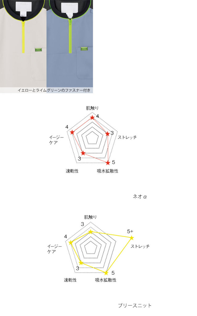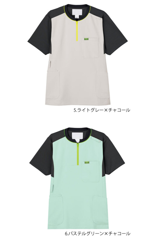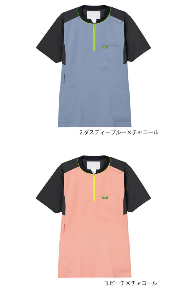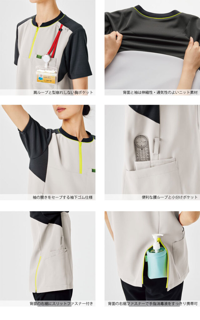 かぶって着るジップアップタイプの男女兼用スクラブ。動きや持ち物の多いOT・PT向けに開発されたスクラブで、トランスファー(抱きかかえの動作)など、一番大きく動く部分に伸縮性の高いニットを施しました。また施術中の暑さ軽減のため、袖から背中にかけて通気性の良いブリースニットを採用したことで、快適に過ごすことができます。後ろ裾ファスナーは、着用時に開けることで着脱が楽チンになり、また開けて施術することで、ものを入れたまましゃがんでも突っ張ることがなく動きやすく、ウエストポーチ着用時は、裾がめくれることなく物が取り出しやすいです。インナーが見えないよう襟ぐりはリブ素材で肌当たりもよく安心。優しいカラー展開で院内を明るく、患者さんの気持ちも癒してくれる、機能性抜群のジップアップスクラブです。