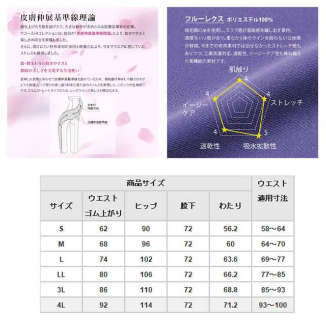 適度なハリ感があり、柔らかく体のラインを拾わない立体感が特徴のワコールHIコレクションシリーズのレディースパンツ。使用しているフルーレクスは、今までの布帛素材では出せなかったストレッチ感もありつつ、工業洗濯対応、速乾性、イージーケア性も有する素材です。後ろ脇ゴム仕様で、ウエストまわりの窮屈感なし。女性の気になるヒップラインは、メッシュ素材を裏地を採用したことで、下着のラインがひびかず、透けにくく安心です。新色のマロウとスミレは、今までとはひと味違った可憐で美しく、女性の強さを表現したカラーに。ワコールの皮膚進展基準線もそのままに、履き心地を素材に合わせて見直してさらに快適になった、ワコールHIコレクションシリーズのレディースパンツです。