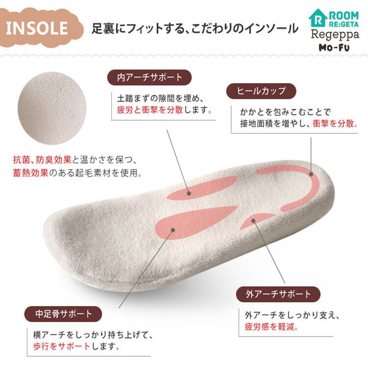 楽しく歩く人を増やしたい、この理念から生み出されたフットウェアです。痛くない、疲れにくい、歩きやすい…そんなフットウェアを目指してリゲッタワークは生まれました。保温効果のあるボア素材を使用した秋冬バージョン『MO-FU』が登場です!インソールはふわふわで柔らかく抗菌防臭、蓄熱効果があり、冬でも足元ポカポカです。