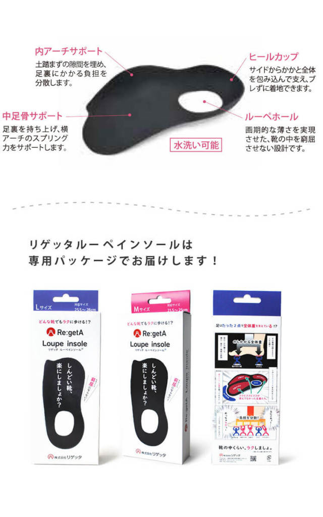 楽しく歩く人を増やしたい、この理念から生み出されたフットウェアです。痛くない、疲れにくい、歩きやすい…そんなフットウェアを目指してリゲッタワークは生まれました。隙間を埋めて足裏に絶妙にフィットする設計です。いつも履いているお気に入りの靴もリゲッタの履き心地に。ハイヒールのパンプス、スニーカーなど、ほぼ全ての履物に対応です。