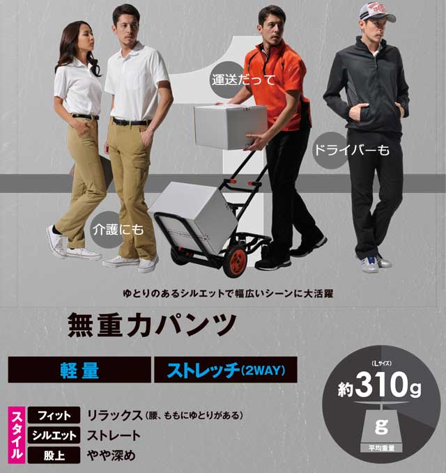 あらゆるニーズに対応する、無重力パンツシリーズ。ゆとりのあるシルエットで幅広いシーンに大活躍。