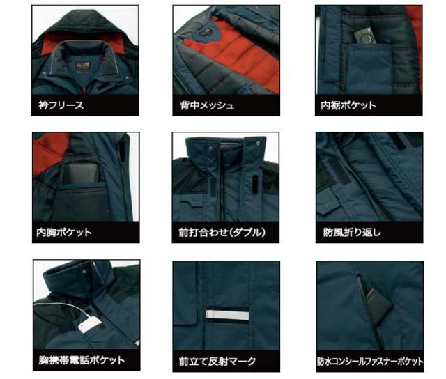 中綿に「軽い・高機能・暖かい!光電子」を使用。さらに寒冷地機能が充実した本格防寒コート。★従来の光電子は軽く、薄く、暖かいが特徴でした。しかし寒冷地のお客様のご意見からより防寒性能を重視した新重防寒を開発しました。寒冷地での冷たい風や冷気に威力を発揮する2重前立て仕様に、身頃側には60gの光電子綿を使用し、効率よく保温。外側には140gの中綿で外の冷気を遮断します。全体に200gのボリュームが絶対の保温性を実現します。防水加工(メド目テープ仕様)はしていませんが、表面の撥水リップは対水圧3000mmに加えフードと背中のV字ゾーンに3層構造のメッシュを使用し、普通のメッシュ構造に比べフードの型くずれと衣服内の吸水性に優れます。(透湿生地では有りません!) この3層構造のメッシュはスポーツ・シューズなどに使用されている吸湿性とクッション性に優れた素材です。デザインも従来の光電子とは差別化し、アウトドアーテイストでスポーティーなデザインにしました。カラーも落ち着いたカラーのブラックとネイビー。(外回りの営業活動や店のラウンド、官庁関係と幅広く)スポーティーで元気な企業イメージのイエローとレッド。(物流や警備、サービス業など)と4色に絞り込みました。(パンツは黒の1色で効率化しました。)収納ポケットも7~8ヶ所設けました。(ブルゾンは1ヶ所コートは2ヶ所の撥水ファスナー仕様)夜間も安心、反射材装備。バックにプリントの入れ易いオーバーユーク仕様など、機能満載で従来の光電子に比べ驚きのエコノミー価格。