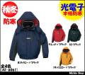 中綿に「軽い・高機能・暖かい!光電子」を使用。さらに寒冷地機能が充実した本格防寒ブルゾン。★従来の光電子は軽く、薄く、暖かいが特徴でした。しかし寒冷地のお客様のご意見からより防寒性能を重視した新重防寒を開発しました。寒冷地での冷たい風や冷気に威力を発揮する2重前立て仕様に、身頃側には60gの光電子綿を使用し、効率よく保温。外側には140gの中綿で外の冷気を遮断します。全体に200gのボリュームが絶対の保温性を実現します。防水加工(メド目テープ仕様)はしていませんが、表面の撥水リップは対水圧3000mmに加えフードと背中のV字ゾーンに3層構造のメッシュを使用し、普通のメッシュ構造に比べフードの型くずれと衣服内の吸水性に優れます。(透湿生地では有りません!) この3層構造のメッシュはスポーツ・シューズなどに使用されている吸湿性とクッション性に優れた素材です。デザインも従来の光電子とは差別化し、アウトドアーテイストでスポーティーなデザインにしました。カラーも落ち着いたカラーのブラックとネイビー。(外回りの営業活動や店のラウンド、官庁関係と幅広く)スポーティーで元気な企業イメージのイエローとレッド。(物流や警備、サービス業など)と4色に絞り込みました。(パンツは黒の1色で効率化しました。)収納ポケットも7~8ヶ所設けました。(ブルゾンは1ヶ所コートは2ヶ所の撥水ファスナー仕様)夜間も安心、反射材装備。バックにプリントの入れ易いオーバーユーク仕様など、機能満載で従来の光電子に比べ驚きのエコノミー価格。