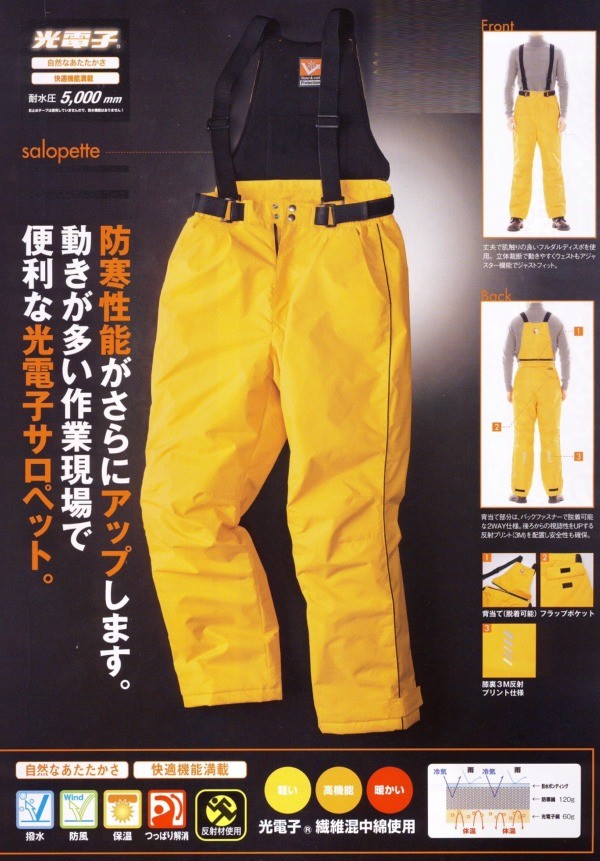 ウィンタースポーツ・ギアの機能満載。防寒性能がさらにアップします。動きが多い作業現場で便利な光電子サロペット!