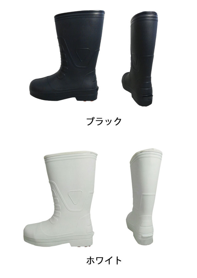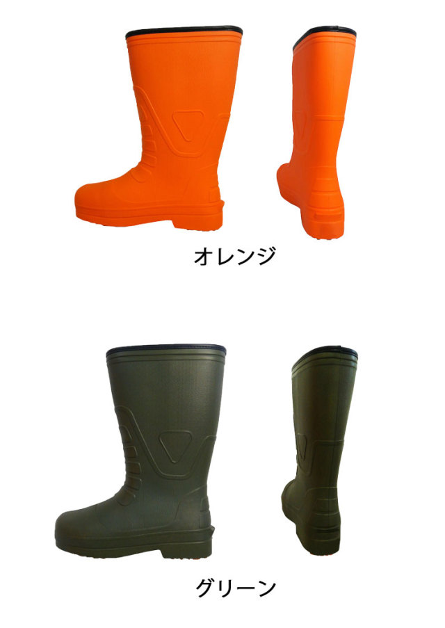 超軽量素材のEVAラバー素材の樹脂先芯入安全長靴です 裏地なしのため、汚れたら丸洗いOK! EVA樹脂が持つ軽量性とゴムの優れた屈曲性を併せ持ったセーフティブーツ 合成ゴム配合のため、通常のEVA素材より、柔らかく屈曲性が良く履きやすい! 脱ぎ履きに便利なカカト部にキックバック付 インジェクション製法&EVA素材のため、軽さと水漏れしにくい構造が売りの長靴です 靴底はゴム貼り仕様で滑りにくい! カラー展開も豊富に4色展開!