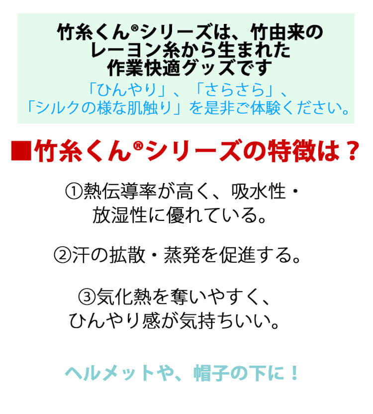 竹由来のレーヨン糸から生まれた作業快適グッズ、竹糸くんシリーズ。「ひんやり」、「さらさら」、「シルクの様な肌触り」を是非ご体験ください。熱伝導率が高く、吸湿性・放湿性に優れています。汗の拡散・蒸発を促進し、気化熱を奪いやすく、ひんやり感が気持ちいい。ヘルメットや、帽子の下に!薄い生地でフィット感アップ。