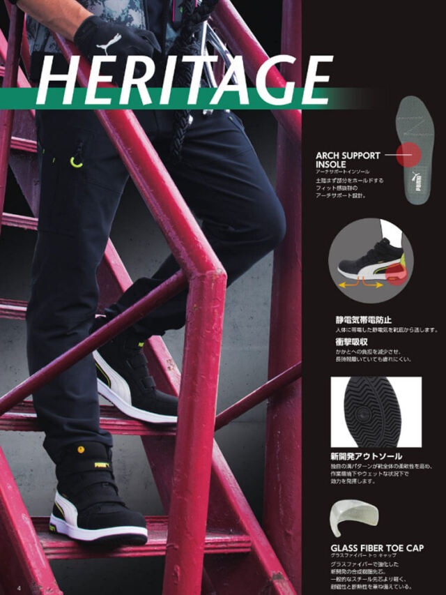 「ヘリテイジ」はこれまでのスポーツテイストのセーフティシューズとは一線を画した、スエード調のカジュアルなデザインが特徴です。建設現場や工場はもちろん、アウトドアやDIYなど、さまざまなシーンで活躍します。「JSAA規格 A種 プロスニーカー」であり、グラスファイバーで強化した合成樹脂製の先芯により、つま先をしっかり保護してくれます。