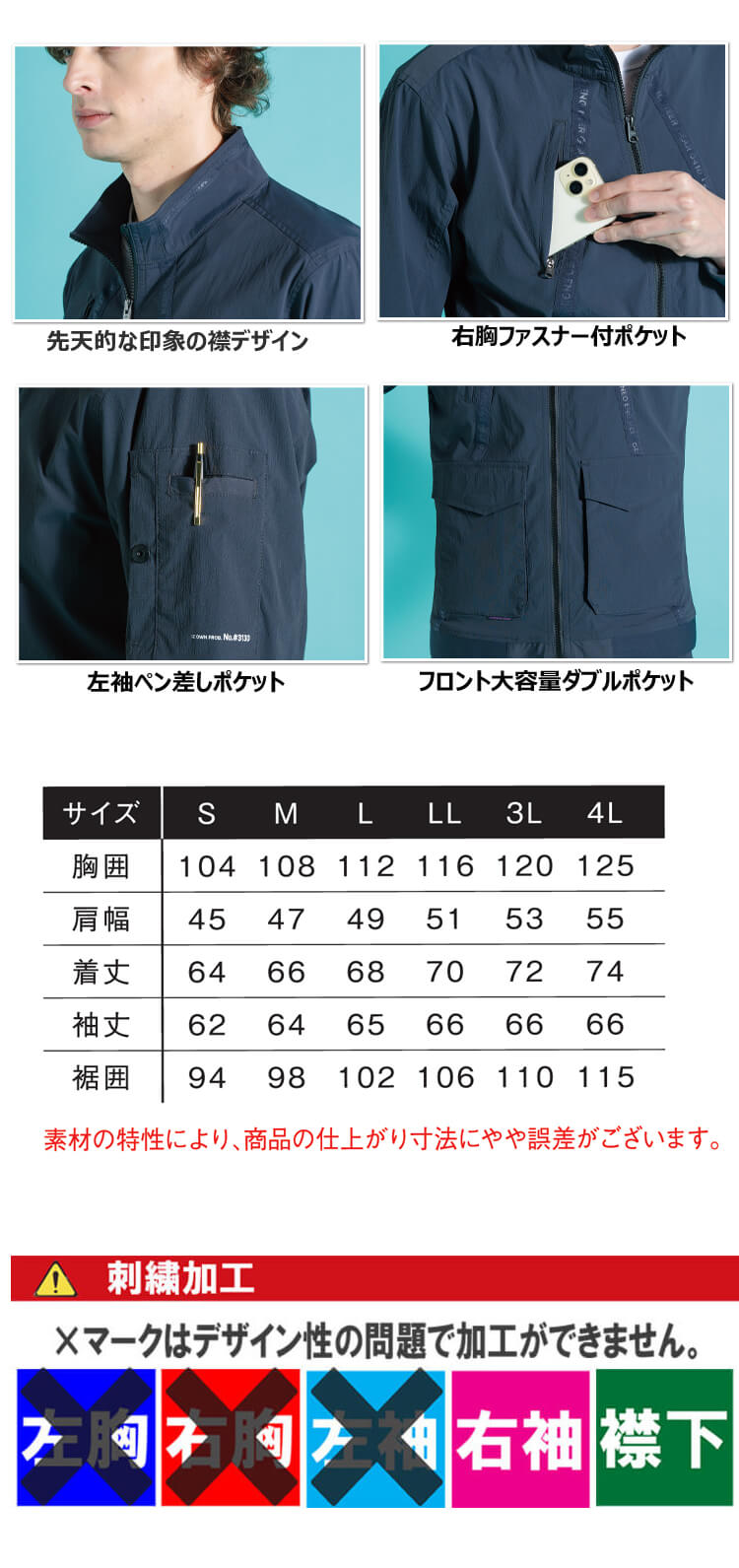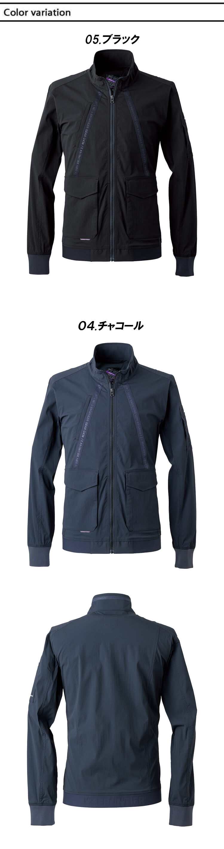 商品説明: 上質感のあるウィローリップ素材を使用した、サマーシーズン対応の高機能ワークジャケット。ナイロン特有のマットな質感とドライな肌触りで、暑い時期でも快適な着用感をキープします。全方向ストレッチによる優れた可動性に加え、先進的な印象を与える衿デザインがシャープなスタイルを演出。機能性だけでなく、見た目にもこだわる現場向けの一着です。