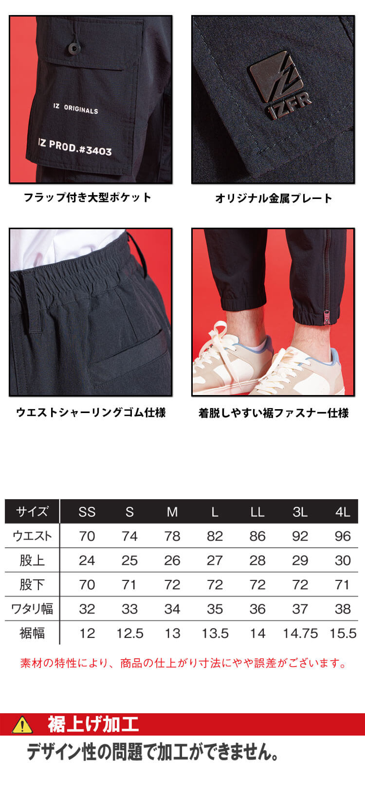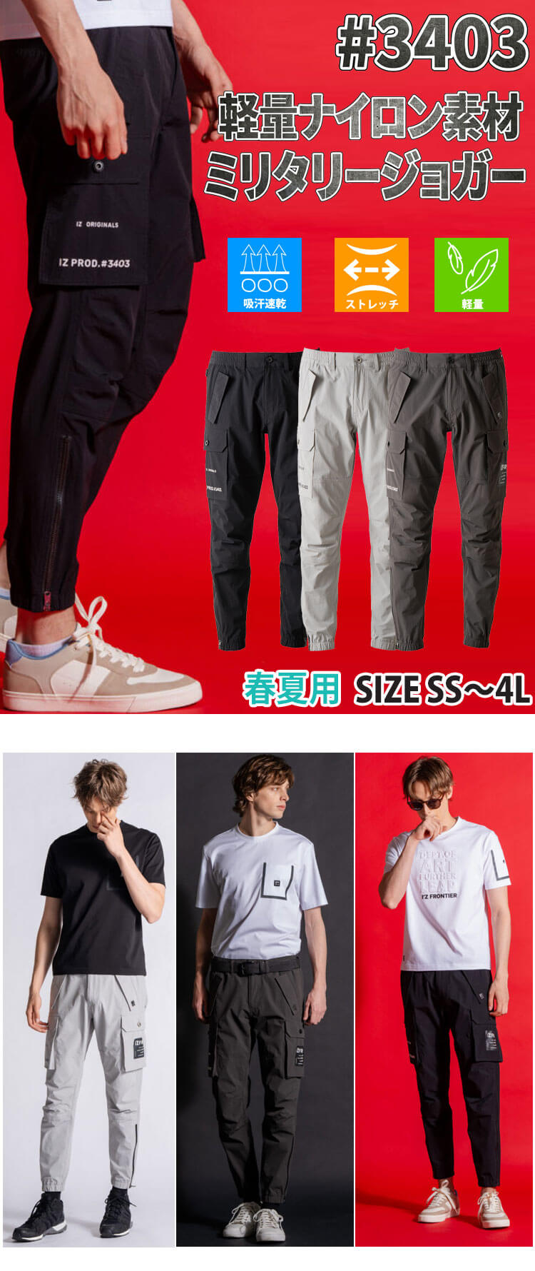 商品説明: アイズフロンティアの3403ジョガーパンツです。軽量で全方向に伸縮する上品なナイロン素材を使用しています。吸汗速乾機能を備え、肌離れがよく、さらっとしたドライな風合いをお楽しみいただけます。 軽量素材でありながら、一般基準を大きく上回る高い堅牢性を誇ります。 タテ約21%、ヨコ約28.8%の優れた伸長率と、1時間後でもタテ約86.7%、ヨコ約88.6%の伸長回復率を実現しており、ストレスのない動きやすさを提供します。機能的なフラップ付き大型ポケットやメカニカルカラビナも採用しています。カーゴポケットの存在感あるロゴプリント、脇ポケット口のさりげない金属プレート、裾のファスナーなどにより、ハイエンドな仕上がりのミリタリーテイストジョガーパンツとなっています。