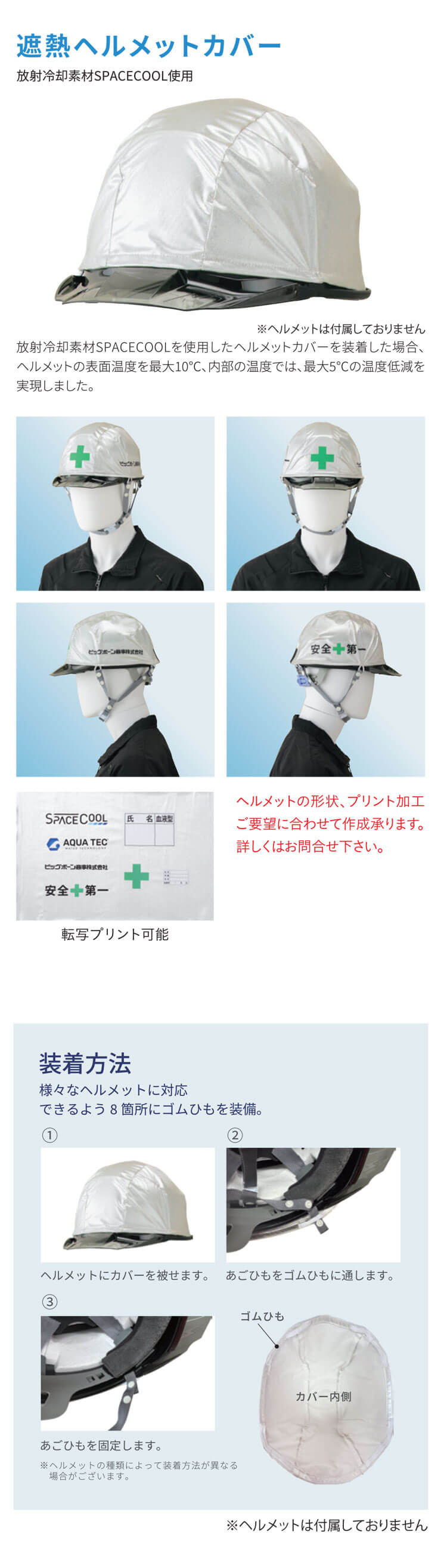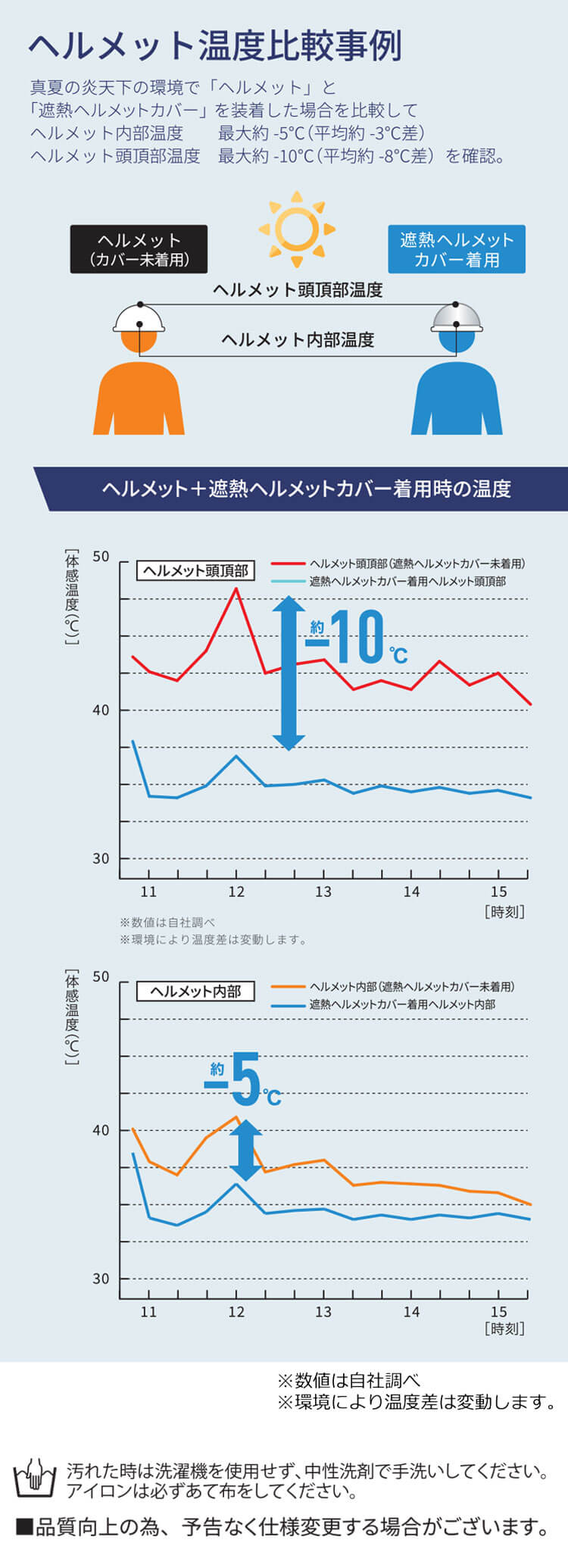放射冷却素材SPACECOOLを使用したヘルメットカバーを装着した場合、ヘルメットの表面温度を最大10℃、内部の温度では最大5℃の温度低減を実現しました。