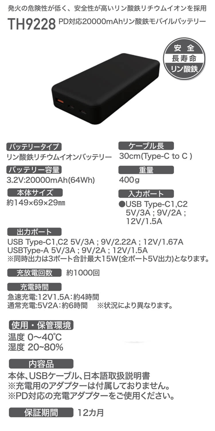 ・バッテリー容量:3.2V/20000mAh(64Wh)