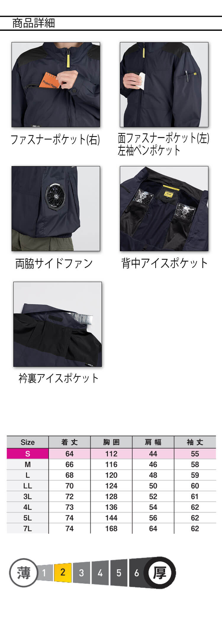 商品説明: シンメンエスエアのサイドファン仕様の長袖ジャケットです。肌ダメージを軽減する遮熱・UVカット、首回り全体からの風抜けを重視したデザインの快適ワイドネック仕様です。首回りなど3カ所の保冷剤ポケットで熱中症対策に配慮したファン付き作業着です。