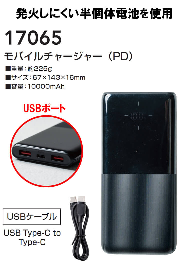 商品説明: 暑さ対策を支える、持ち運びやすい高性能バッテリー。SOWA 17065は、10,000mAhの大容量とコンパクトさを兼ね備えたPD対応モバイルチャージャーです。発火しにくい半固体電池を採用し、安全性にも配慮。EFウェア・空調作業服の予備バッテリーとして、現場作業、警備、倉庫作業、アウトドアまで幅広く活躍します。高速充電に対応するPD規格採用で、必要な電力を効率よく供給。毎日の作業を快適に支える一台です。