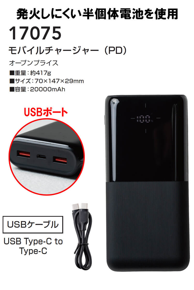 商品説明: 暑さ対策を支える、持ち運びやすい高性能バッテリー。SOWA 17075は、20,000mAhの大容量とコンパクトさを兼ね備えたPD対応モバイルチャージャーです。発火しにくい半固体電池を採用し、安全性にも配慮。EFウェア・空調作業服の予備バッテリーとして、現場作業、警備、倉庫作業、アウトドアまで幅広く活躍します。高速充電に対応するPD規格採用で、必要な電力を効率よく供給。毎日の作業を快適に支える一台です。