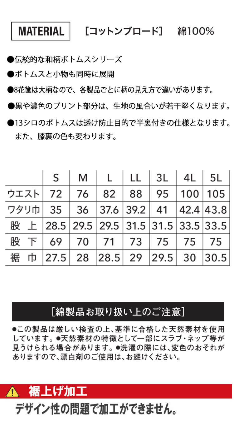 商品説明: 綿100%の伝統的な和柄ボトムスです。祭り・飲食店などにおすすめです。