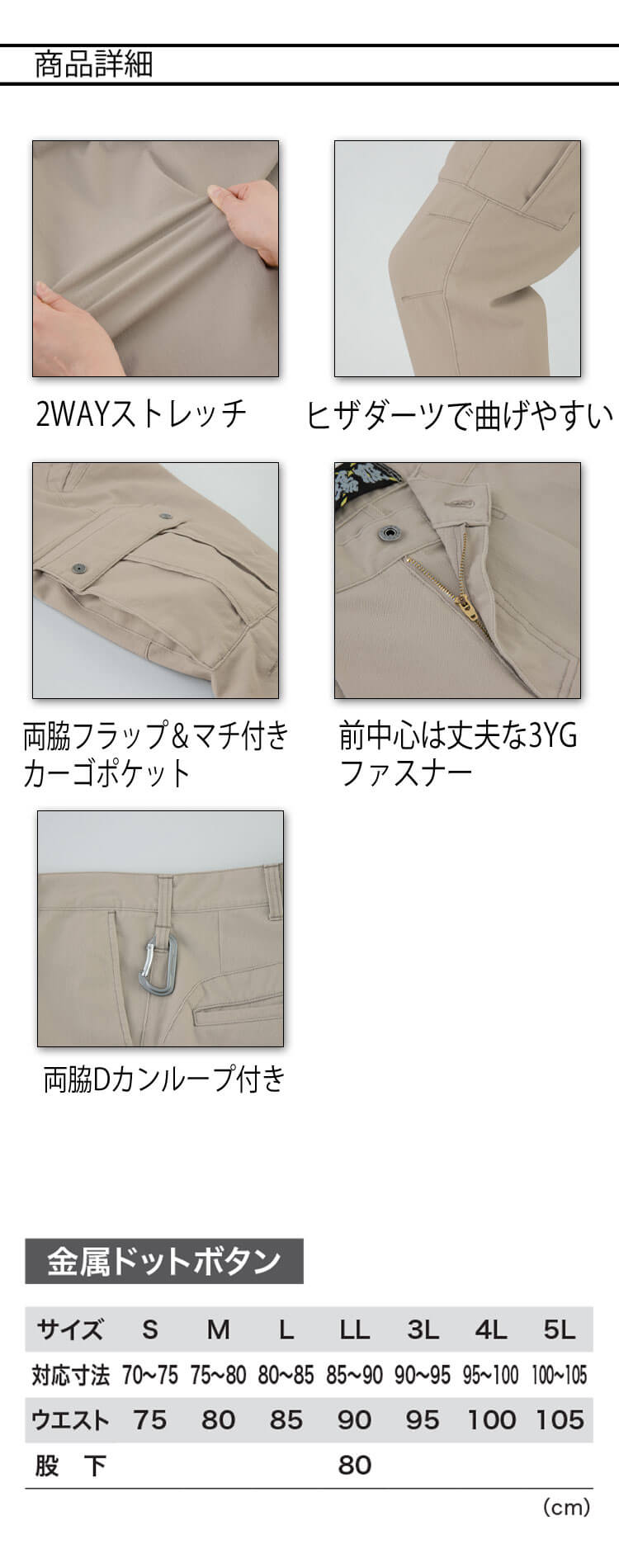 商品説明: ジーベック現場服のカーゴパンツです。「現場で動き、街で映える。」タテヨコに伸びる2WAYストレッチと、綿95%スラブツイルのナチュラルな風合いが魅力のワークパンツです。洗い加工による肉厚で丈夫な生地がハードな作業を支えつつ、カジュアル感のあるデザインでチームウェアにも最適な一着です。
