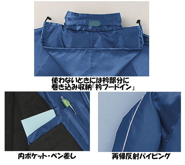 ● 衿フードイン:使わない時には衿の部分に巻きこみ収納できるフード仕様。