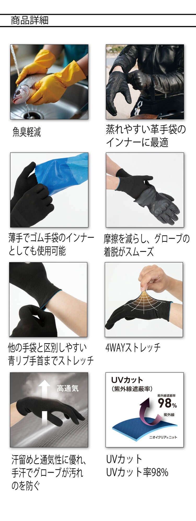 〇かいた汗を素早く吸収し、常にサラッとドライに保つ蒸れやすい革手袋のインナーに最適。
