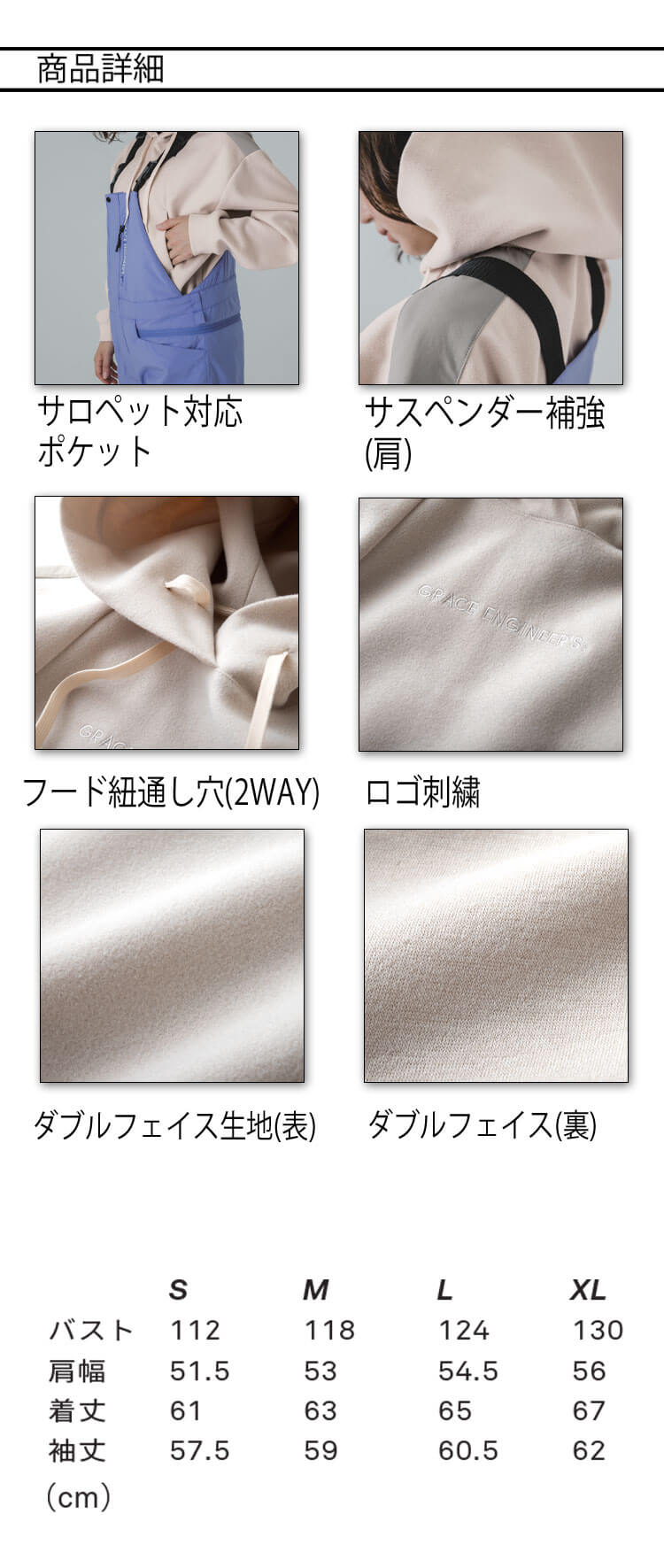 商品説明: グレースエンジニアーズのサロペット好きのためのフーディーパーカーです。サロペットの胸当て部を意識した特徴的な位置のポケットもデザイン的にワンランクアップしています。サスペンダーで擦れやすい肩部分の補強布など、ディテールも健在です。生地は温もりと優しさを感じるメルトンライクな表面と、着やすさを考えたプレーンな質感の裏面なダブルフェイス生地仕様になっています。ヒップオープン機能との相性を考えた丈感なのもこだわりポイントです。